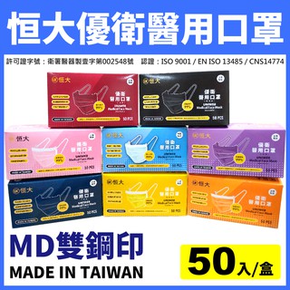 恒大 優衛 成人 醫用口罩(深海藍) 50入/盒,醫療口罩,衛署醫器製壹字第002548號;台灣製造 品質最安心